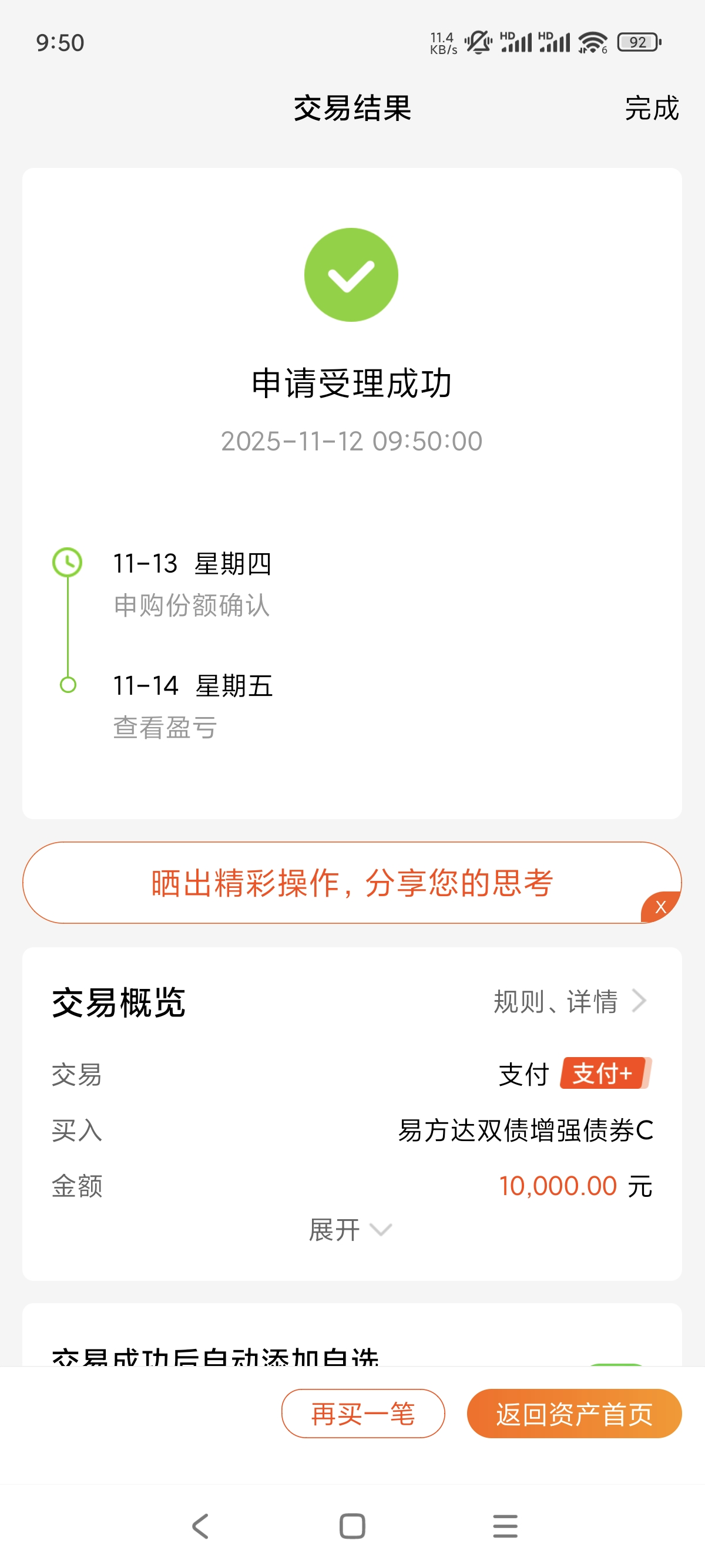 给大家汇报一下,从10月底以来,连续买入的易方达双债增强债券C(110036),截至11月11日,持仓盈利0.32%,基本保持着稳定的回报。