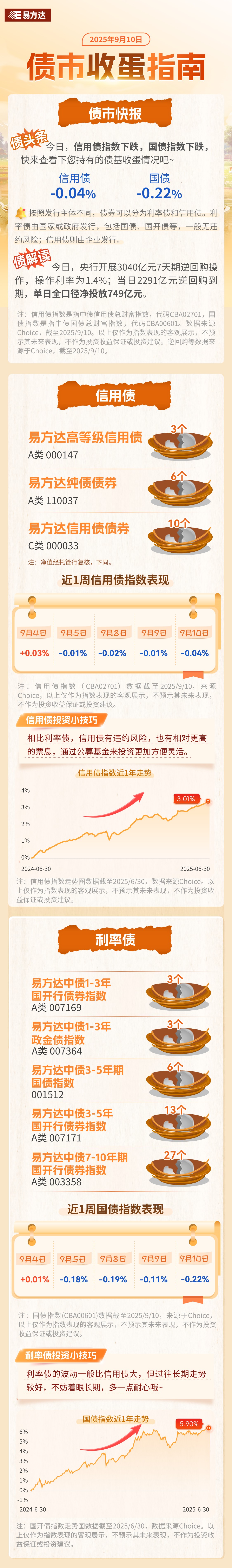 9月10日,信用债指数下跌、国债指数下跌,快来查看您持有的债基收蛋情况吧~