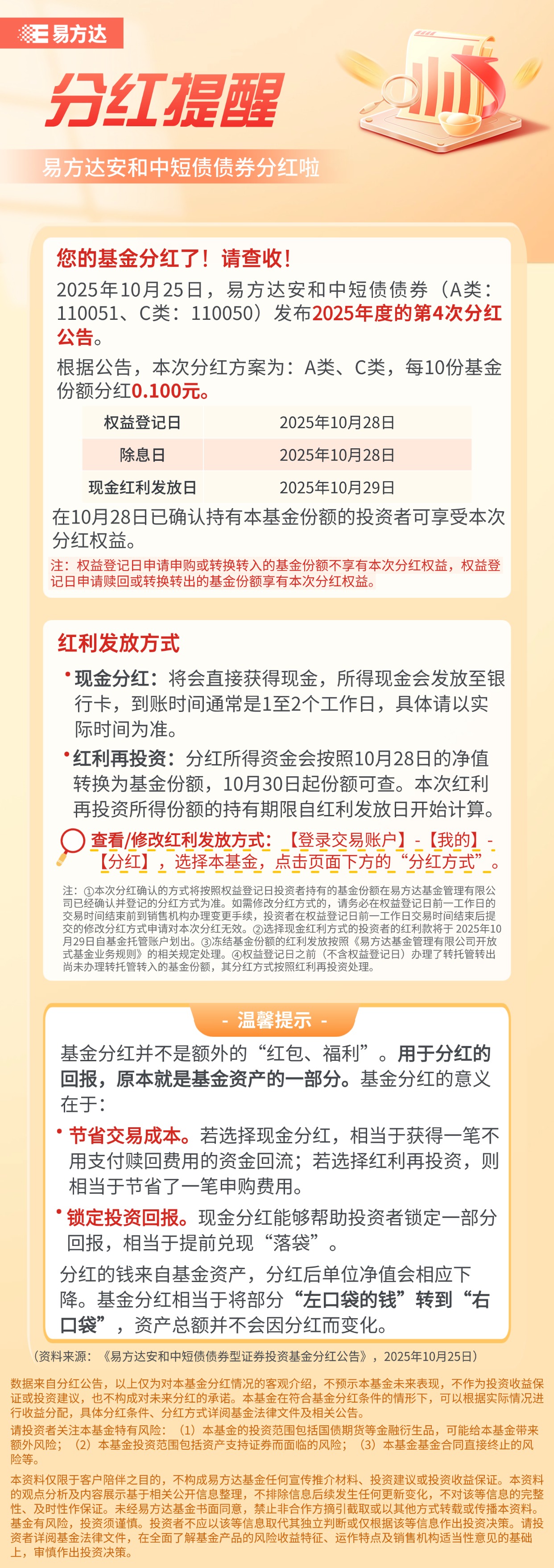 2025年10月25日,易方达安和中短债债券($易方达安和中短债A(OTCFUND|110051)$$易方达安和中短债C(OTCFUND|110050)$)发布2025年度的第4次分红公告。