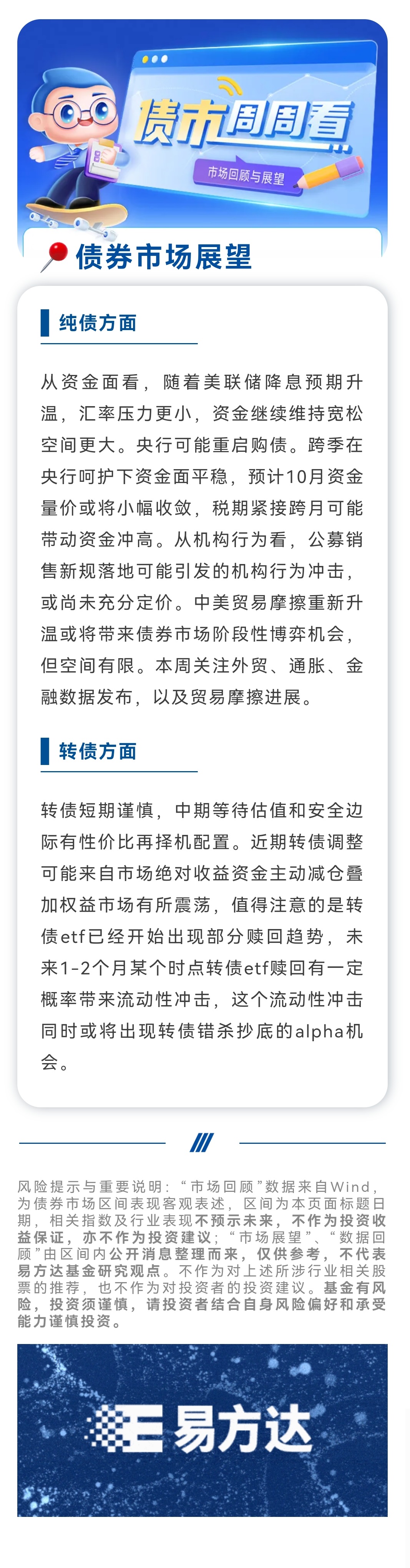 从资金面看,随着美联储降息预期升温,汇率压力更小,资金继续维持宽松空间更大。央行可能重启购债。跨季在央行呵护下资金面平稳,预计10月资金量价或将小幅收敛,税期紧接跨月可能带动资金冲高。从机构行为看,公募销售新规落地可能引发的机构行为冲击,或尚未充分定价。中美贸易摩擦重新升温或将带来债券市场阶段性博弈机会,但空间有限。本周关注外贸、通胀、金融数据发布,以及贸易摩擦进展。