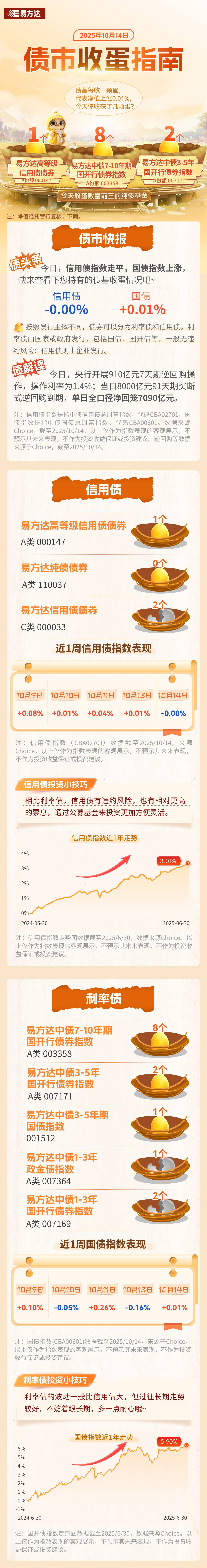 10月14日,信用债指数走平、国债指数上涨,快来查看您持有的债基收蛋情况吧!
