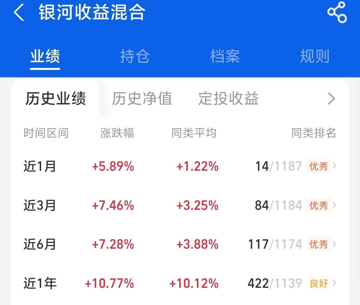 今日债市盘面分化,利率债高开低走,信用债继续维持晴天,权益走势好转,在此行情下,继续加仓$银河收益混合$ 是只偏债的基,持仓以信用债为主,搭配小部分利率债,跟可转债,属于进可攻退可守,作为偏债混合型基金,兼顾股债投资,攻守灵活,近一个月收益率+5.89%,表现优秀,今天继续加了!