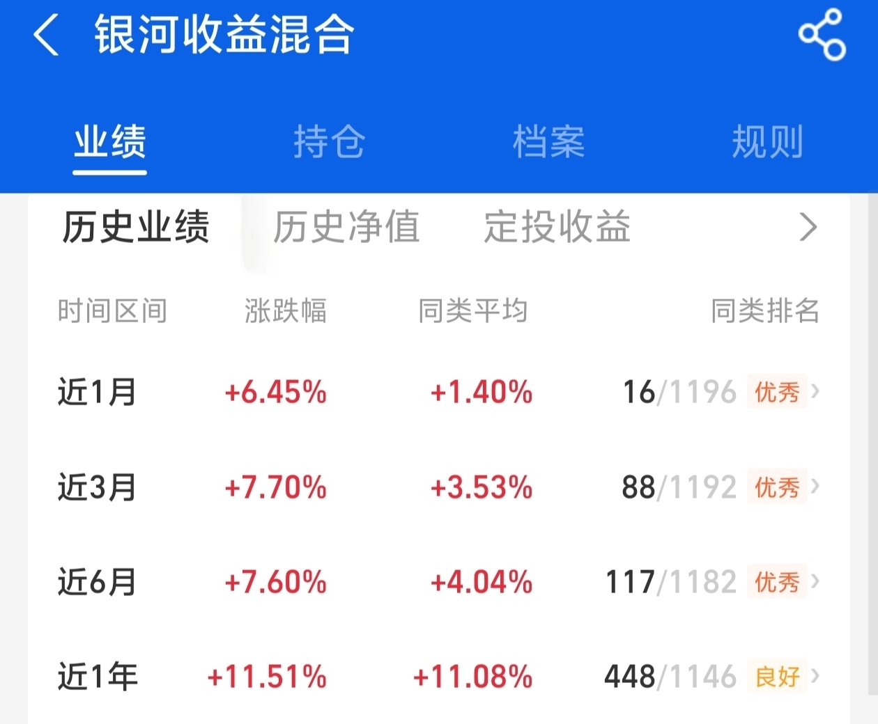 A股早盘震荡,几大指数转红后走势分化;债市方面,国债期货集体低开,利率债小涨居多,信用债涨跌互现。布局5000元的$银河收益混合$ 虽然是只偏债的混合型基金,但是里面有股票持仓占比10.97% ,前十持仓占比合计6.59%,涉及通信、金融、能源等领域近一个月收益率+6.45%,近一年收益率+11.51%。今天加5000元,看重它资产配置均衡,在股债市场波动中有机会分散风险,获取稳健收益。