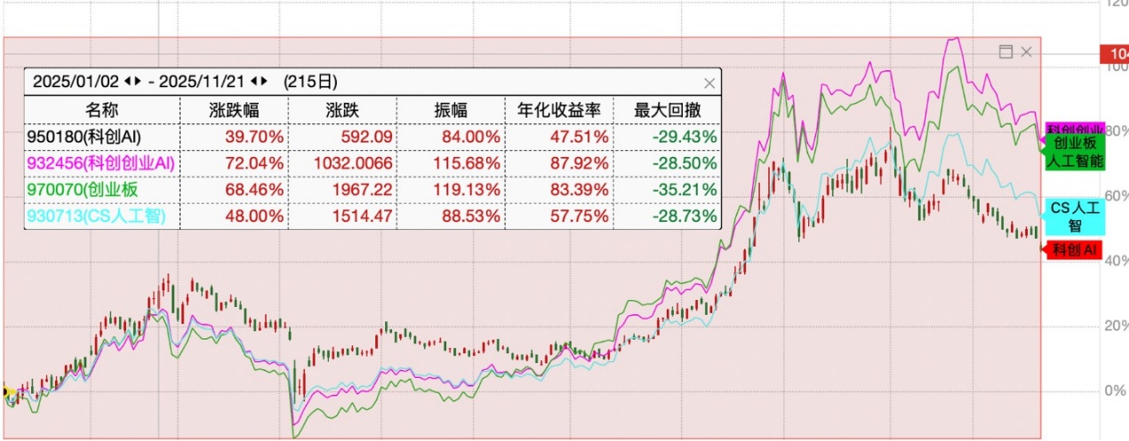 业绩数据更能说明问题。Wind数据显示,截至2025年11月21日,该指数自2019年12月31日基日以来累计回报达146.46%,大幅跑赢科创综合指数(50.34%)和创业板指数(62.40%)。这一表现源于AI产业的强劲景气度:全球算力需求持续攀升,国际AI龙头业绩与指引双超预期;国内市场同样多点开花,算力建设与模型研发齐头并进。