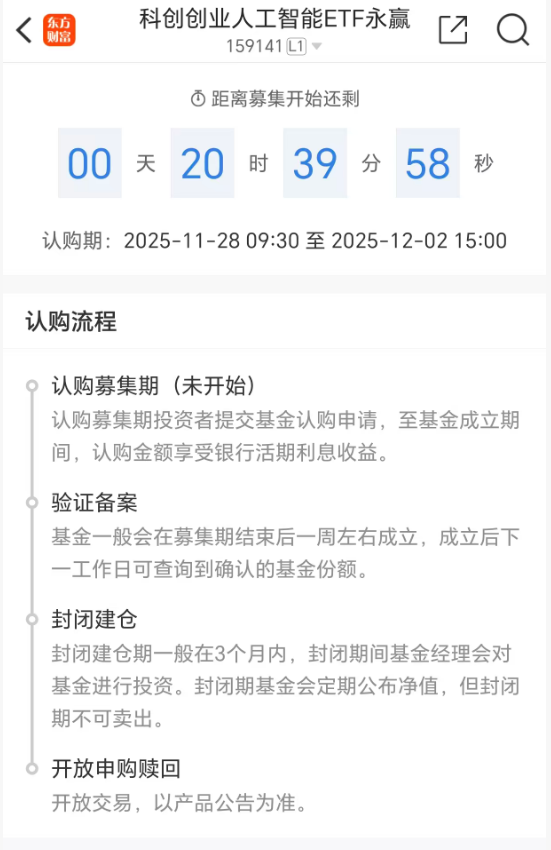 最近关注科技投资的朋友肯定注意到了,全市场首批科创创业人工智能明天开售,我打算买点永赢中证科创创业人工智能ETF,还是看好这只双创产品的,开售期为2025年11月28日至2025年12月2日,发售时间不长,想上车的可得提前做好准备。