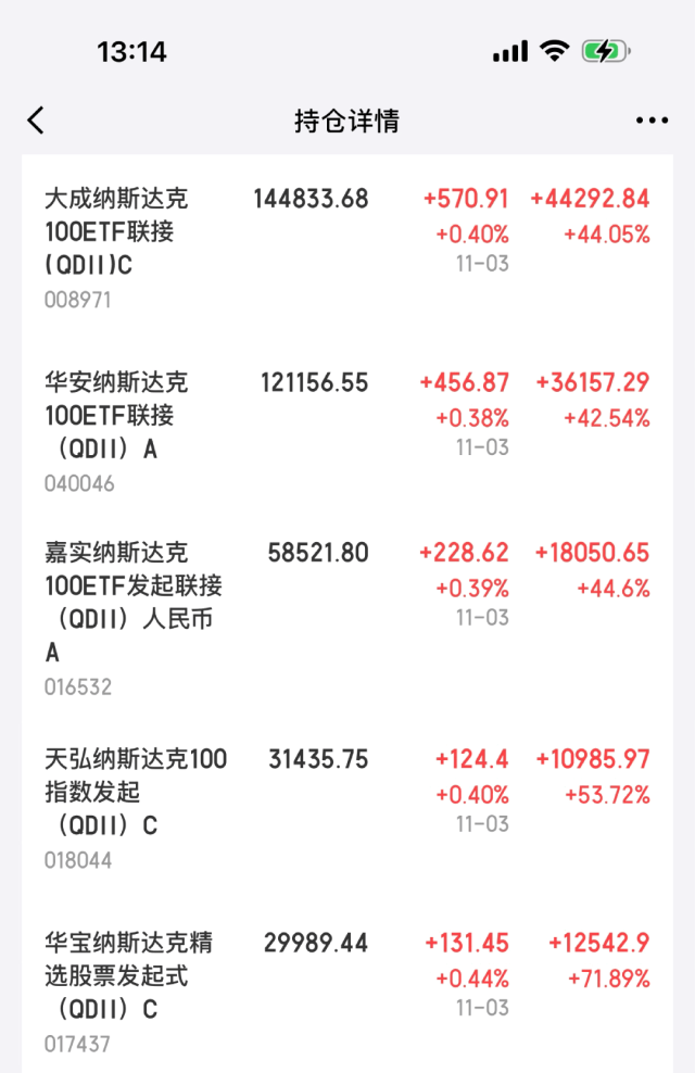我持有120万的纳指,很多纳指都赚了40%、50%以上,安全垫也是比较厚的。最近纳指的限购越来越严了,一些投资美股的主动管理基金额度也变紧了,我的纳指还没买够要抓紧时间了,趁着大跌我继续补点。