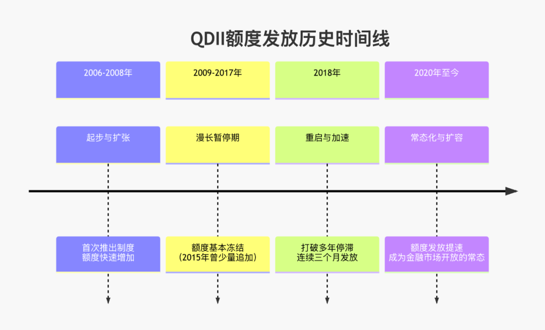 历史上QD额度发放有多个不同的阶段,很多人关心啥时候纳指会有新的额度?我们看下2020年后的额度发放情况。