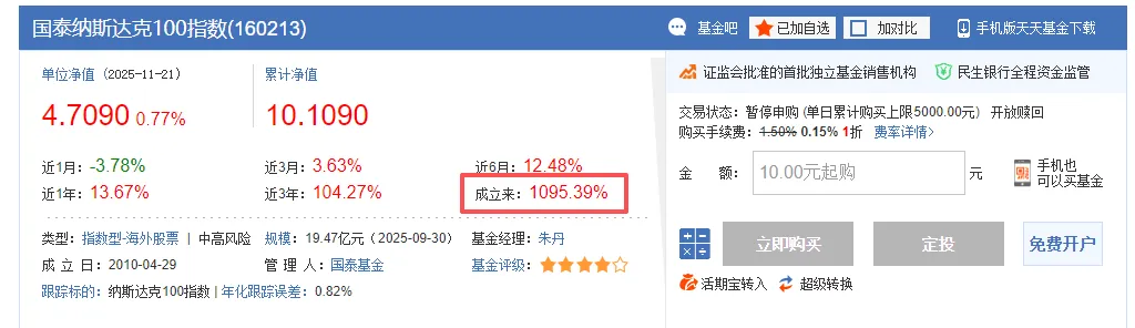 该基金成立于2010年4月29日,截至2025年11月21日,至今有15.5年的时间,累计收益率为1095.39%(复合年化回报率为17.25%),这还是跑输指数近220%的情况下实现的。