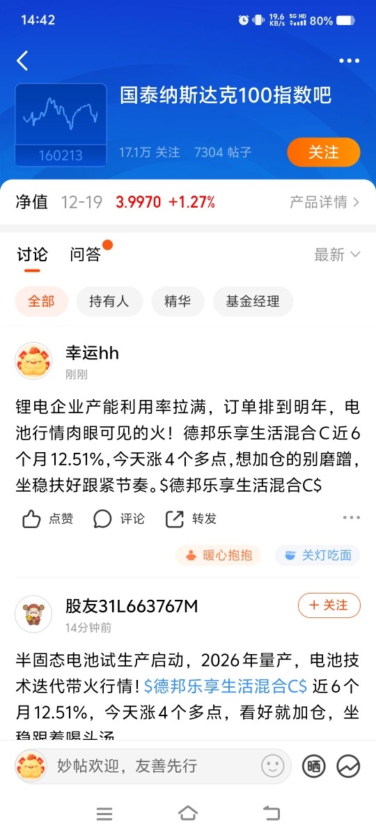 锂电企业产能利用率拉满,订单排到明年,电池行情肉眼可见的火!德邦乐享生活混合 C 近 6 个月 12.51%,今天涨 4 个多点,想加仓的别磨蹭,坐稳扶好跟紧节奏。$德邦乐享生活混合C$