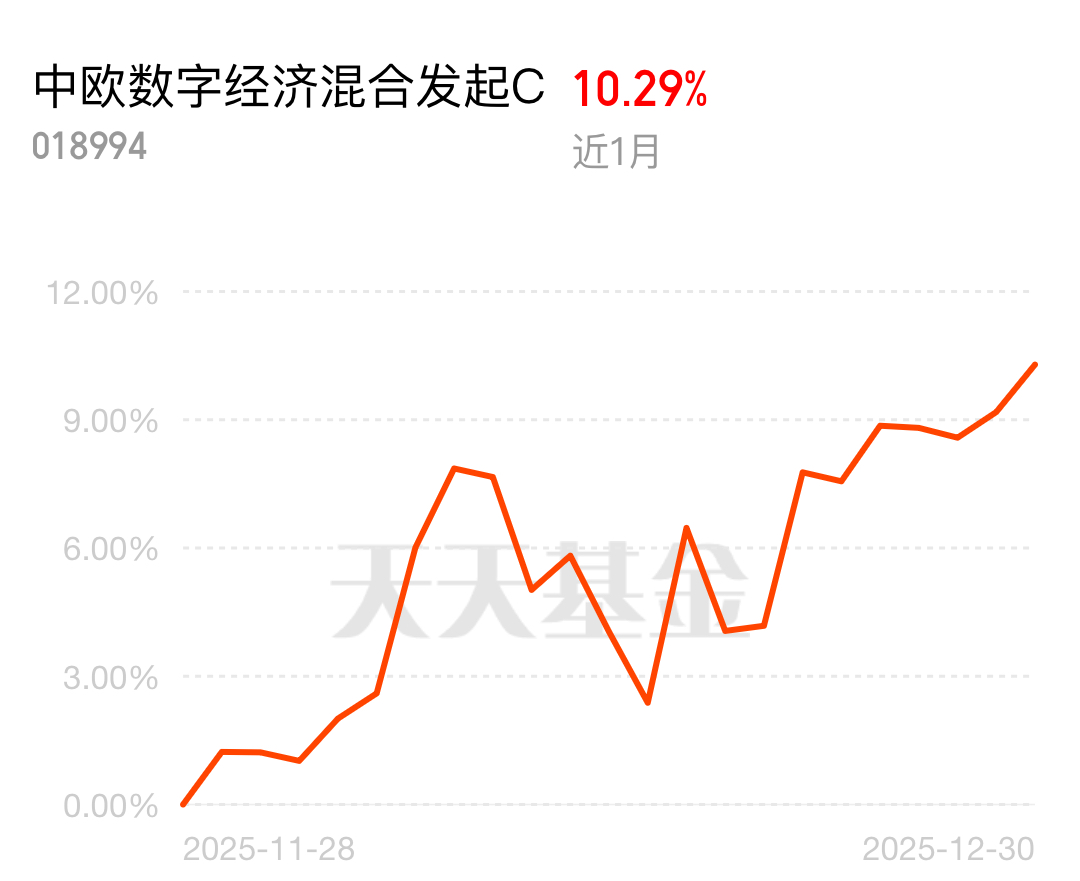 中央经济工作会议部署重点产业链升级,AI 作为核心引擎受重视。中欧数字经济混合发起 C 近 1 月 10.29%,聚焦 AI 算力核心环节,相比同类基金更集中,短期配置跟着政策和行情走。$中欧数字经济混合发起C$