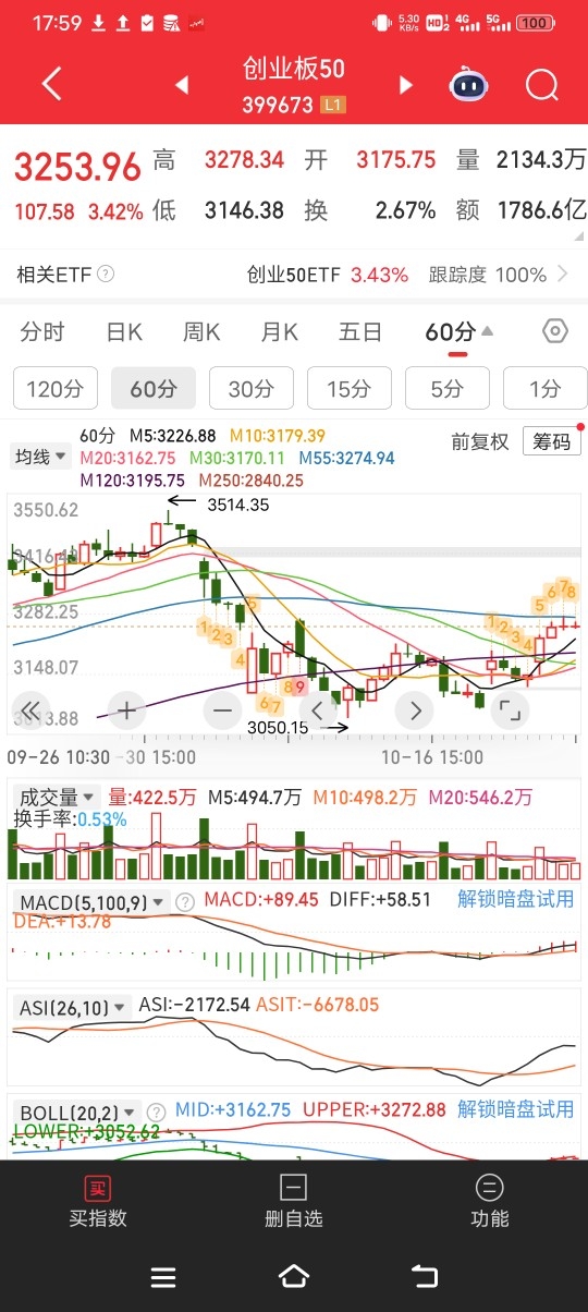 再看今天最猛的创业板50指数的55小时图。 前面跳空往下,跌的比较多,现在同样也面临一个55K线反压。 所以明天基本就是震荡,除非能够继续放量。但是话又说回来,大会还没开完,内资会马上跟着外资动手?