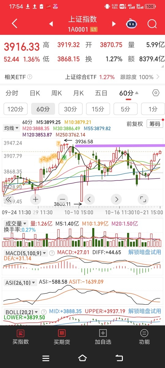 上证小时图,如下。 支撑在120小时线,已经三次撑住。 压力在上边的3930、前高3936,目前尽管有放量,但是我感觉不够,应该冲不破。