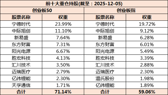 因此,创业板50指数的龙头属性更纯粹,持仓占比更集中,前十大重仓股集中度达到71.14%。