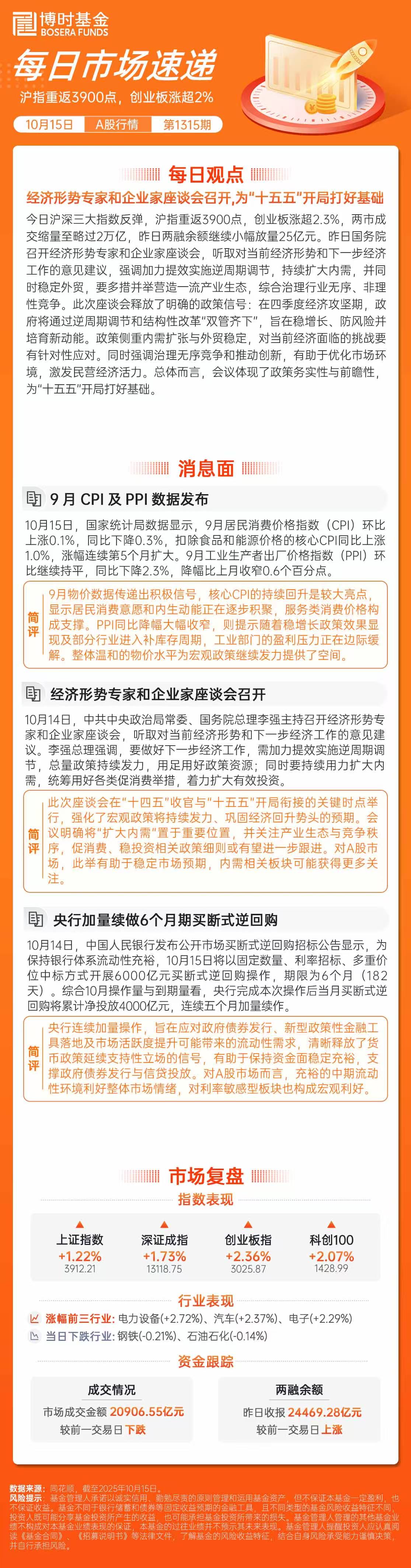 【博时市场点评10月15日】沪指重返3900点,创业板涨超2%