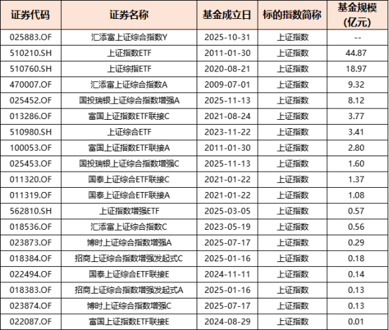 全市场跟踪上证指数的产品有19只(不同份额分开统计),上证指数ETF(510210)是规模最大的,也是场内成立时间最早的。