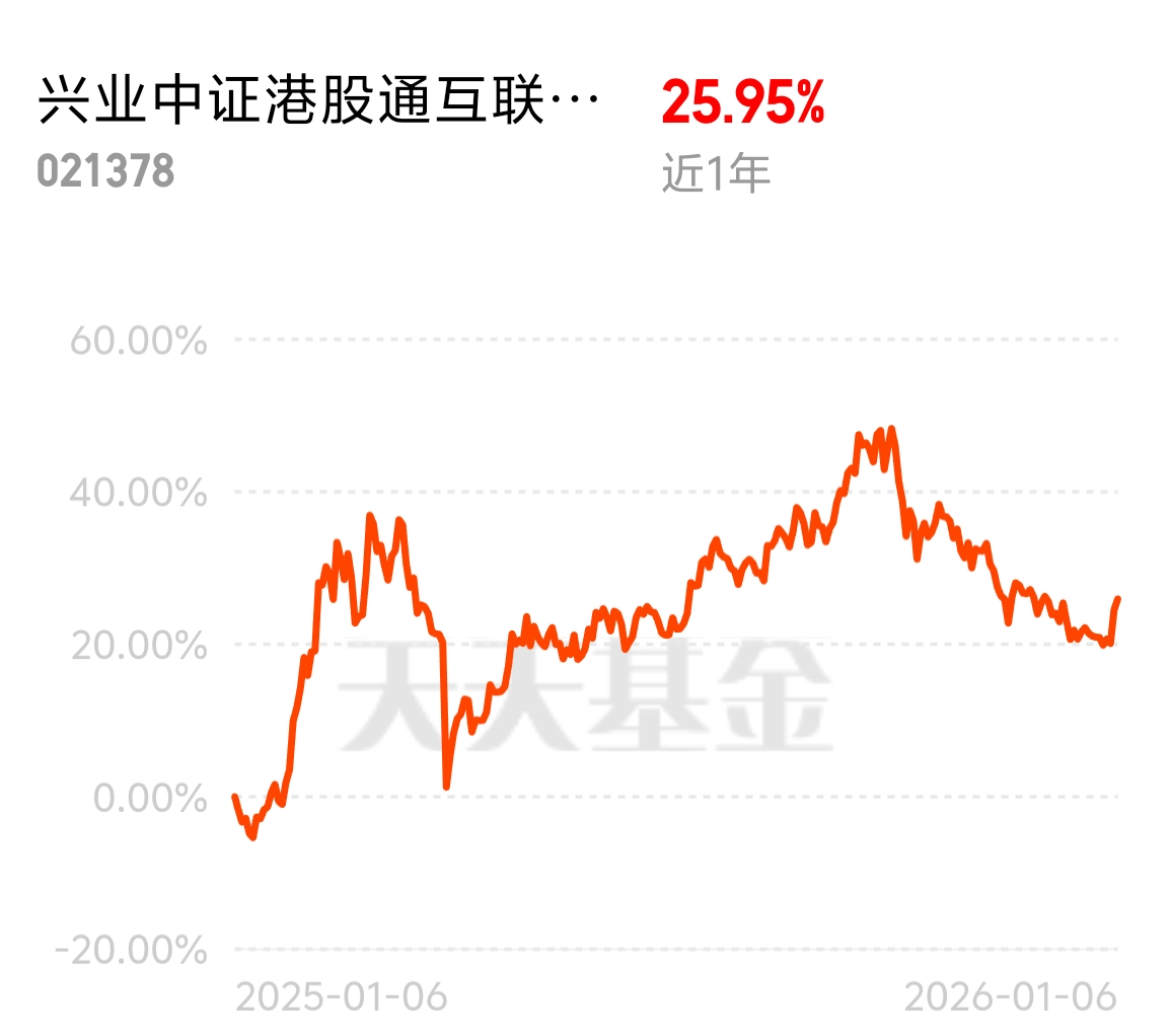 港股互联网现在靠 AI 涨起来啦!龙头公司赚钱越来越多,估值还没上去,这会儿入手超划算~ 想轻松布局的朋友,兴业中证港股通互联网指数 C 近 1 年涨了 25.95%!腾讯、阿里这些大龙头全包含,一键就能买$兴业中证港股通互联网指数发起式C$