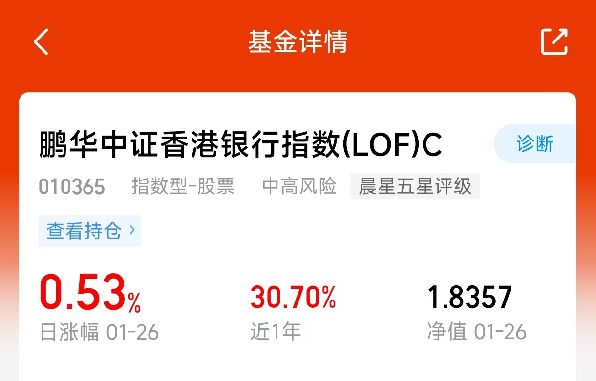 今天我对$鹏华香港银行指数(LOF)C$(010365)进行了小幅加仓。过去一个月市场波动明显,但香港银行板块整体表现平稳,调整幅度有限。该指数成分由香港市场主要的银行股构成,在当前的市场背景下,我认为适当持有一些具备高股息和低估值的资产是合理的配置选择。这个C份额在费用安排上对中短期投资较为有利。完成这笔投资后,我会持续关注市场发展,灵活应对。#金价盘中突破5100美元大关!机构猛吹#