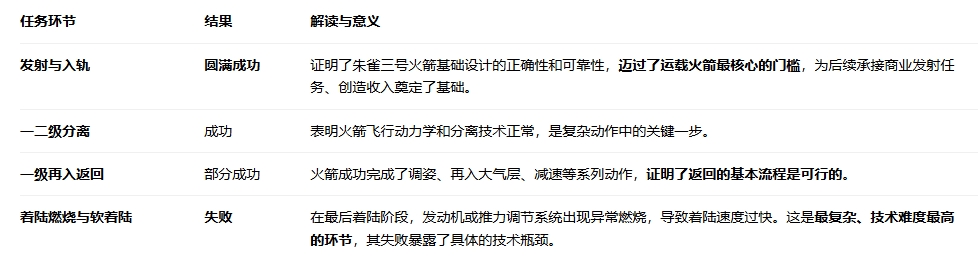 结论:此次任务实现了 “保底成功”(入轨) ,并 “挑战了高难度目标”(回收) 。对于一款全新研制的可回收火箭,首次飞行就进行回收尝试,本身就是一种自信和进取心的体现。此次失败为后续改进提供了无可替代的真实飞行数据,价值巨大。