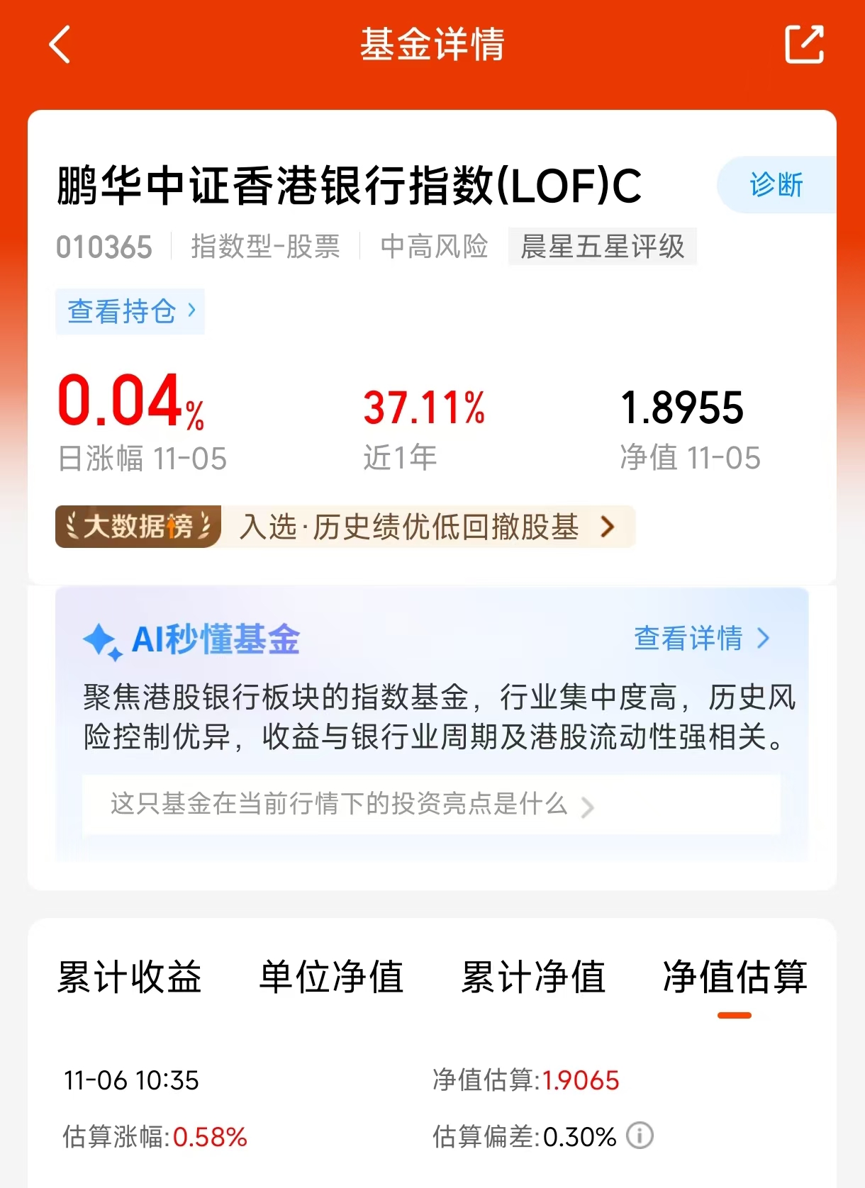 在投资的世界里,普通投资者常常面临一个难题:想赚取市场的红利,却苦于专业知识的不足和风险的难以掌控。直接挑选个股?不仅需要深入研究每家公司的财报和行业动态,还得时刻担心市场波动带来的损失。分散投资虽好,但成本高昂——时间和精力都耗不起。这时,一个更聪明的选择浮出水面:借道指数基金,让专业机构帮你打理,轻松捕捉行业机遇。而当前,港股银行股正迎来关注期,它们就像经济复苏的“晴雨表”,汇聚了全球巨头,这些企业不仅根基深厚,还受益于经济的韧性和开放政策。$鹏华香港银行指数(LOF)C$(010365)正是这样的工具,助你轻松上车。#4000点 到底要不要止盈?#