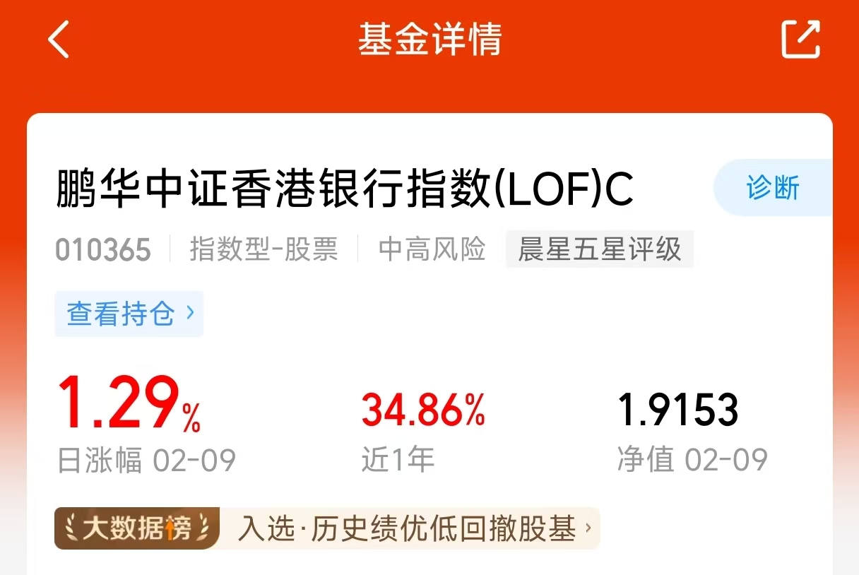 市场情绪降温,很多高估值的板块都在回调。这时候就需要$鹏华香港银行指数(LOF)C$(010365)这样的低估值品种来撑场面。我今天也配置了一些,看中的就是它那种“跌不动”的特性。香港那边的银行,监管严格,经营规范,不容易出黑天鹅。遇事不决香港银行,现在正是上车的好时候。#全球股市集体大反攻 你的仓位配置如何?#