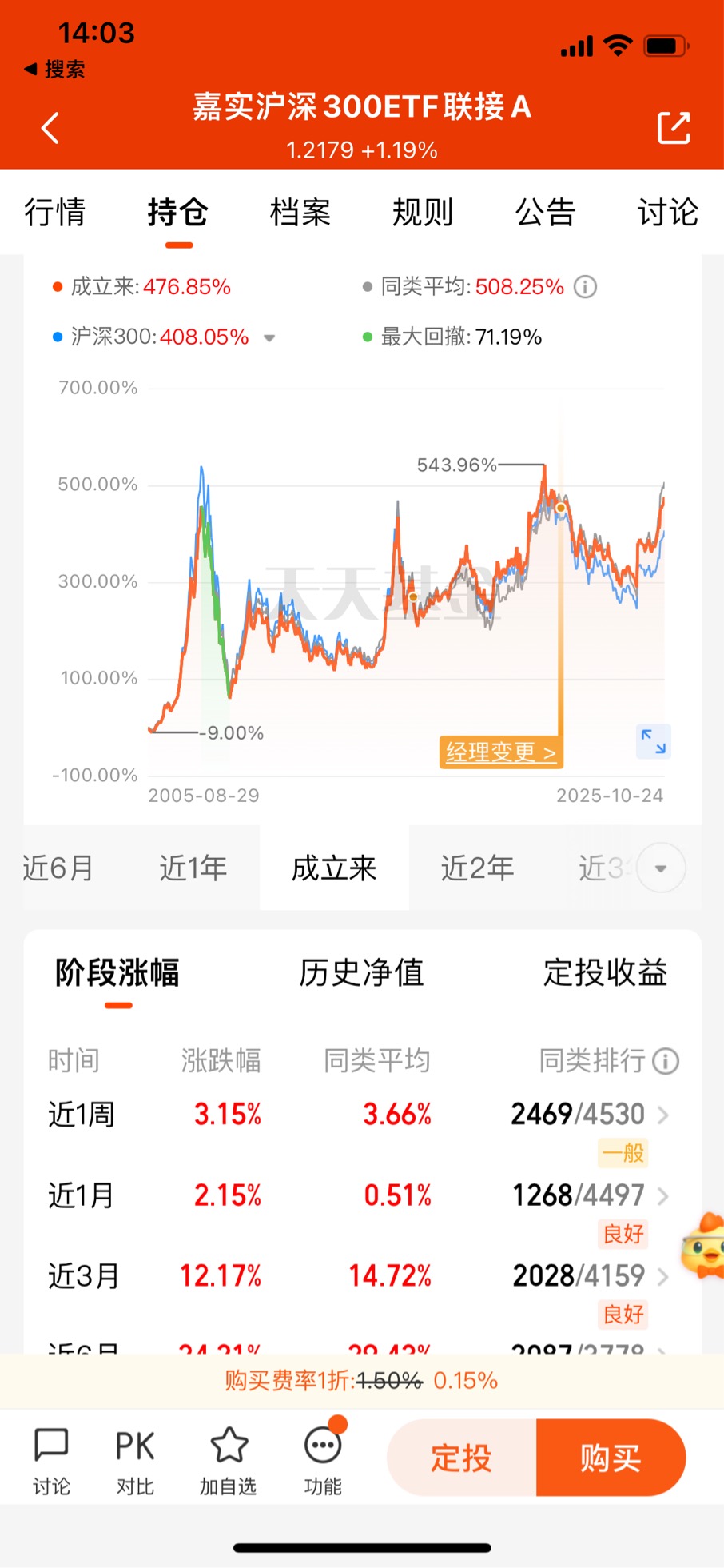 4、嘉实沪深200ETF联接A成立以来(20年2个月左右)收益率476.85%。期间较大回撤幅度-71.19%、年均23.6%左右,很不错的样子。只是回撤波动幅度太大了,拿得住这20余年的几乎没有几人!