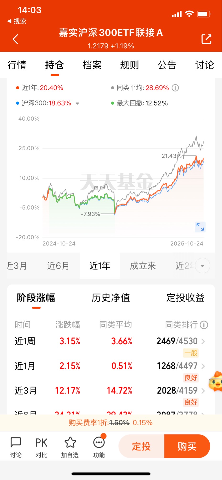 1、嘉实沪深300ETF联接A近一年收益率20.4%,还不错!期间较大回撤幅度-12.52%。所以近一年的股市行情还不错!