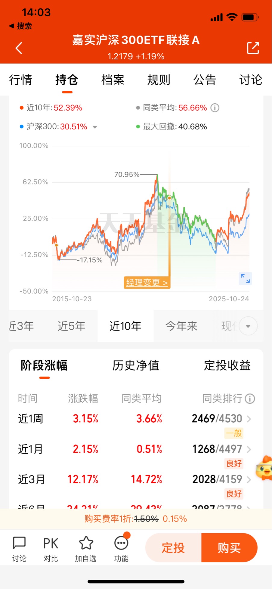 3、嘉实沪深200ETF联接A近10年收益率52.39%,期间较大回撤幅度-40.68%。如果能耐心坚持年均收益10%左右,勉强还不错的样子。就是波动回撤幅度太大了,估计能坚持下去的也不多呀。