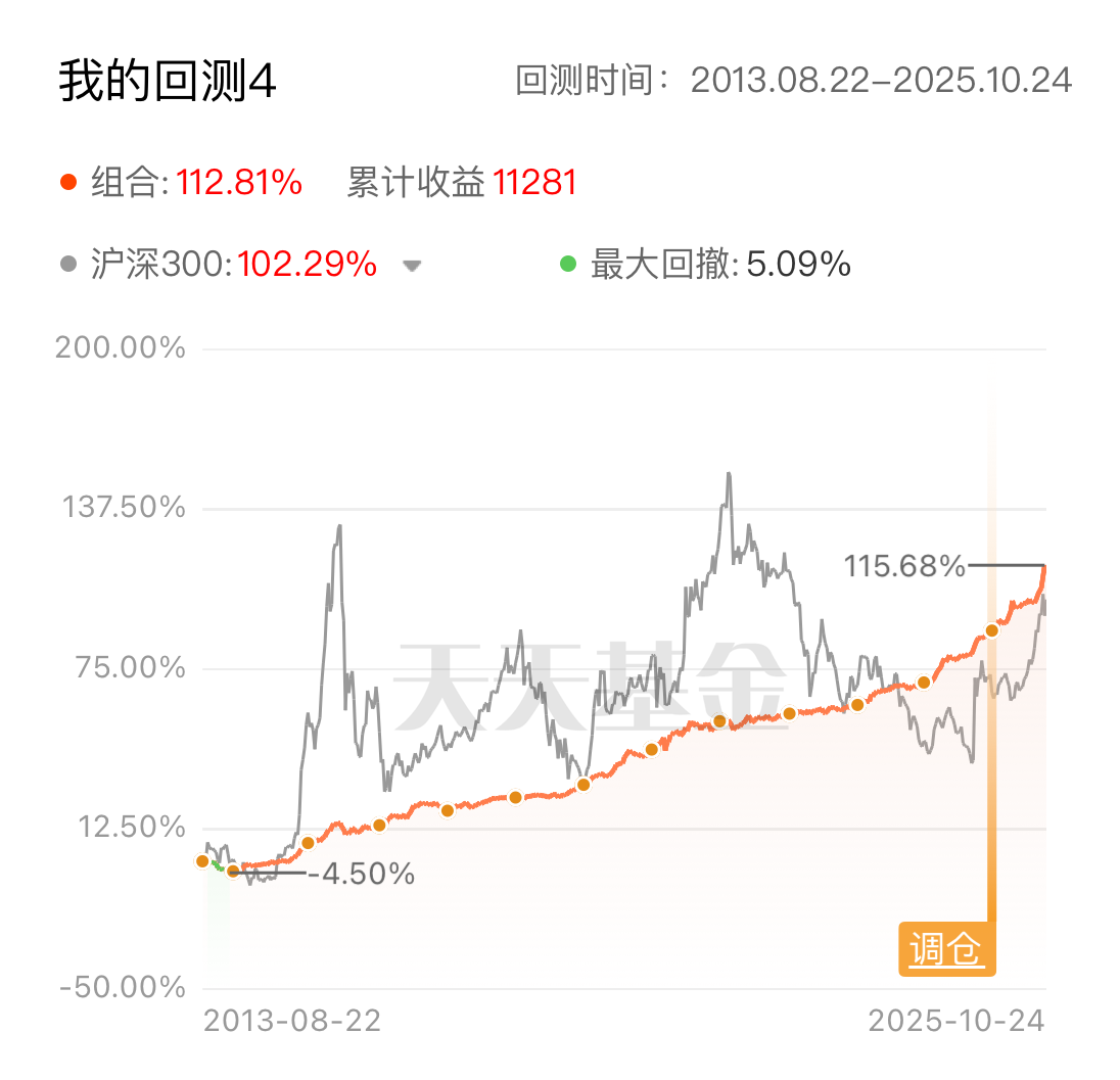 稳健配置组合策略启发版本70%债券、20%的黄金ETF、10%的沪深300。回测验证12年余收益112.81%、期间较大回撤幅度-5.09%。收益虽然比较低但估计大部分投资者能拿得住了。
