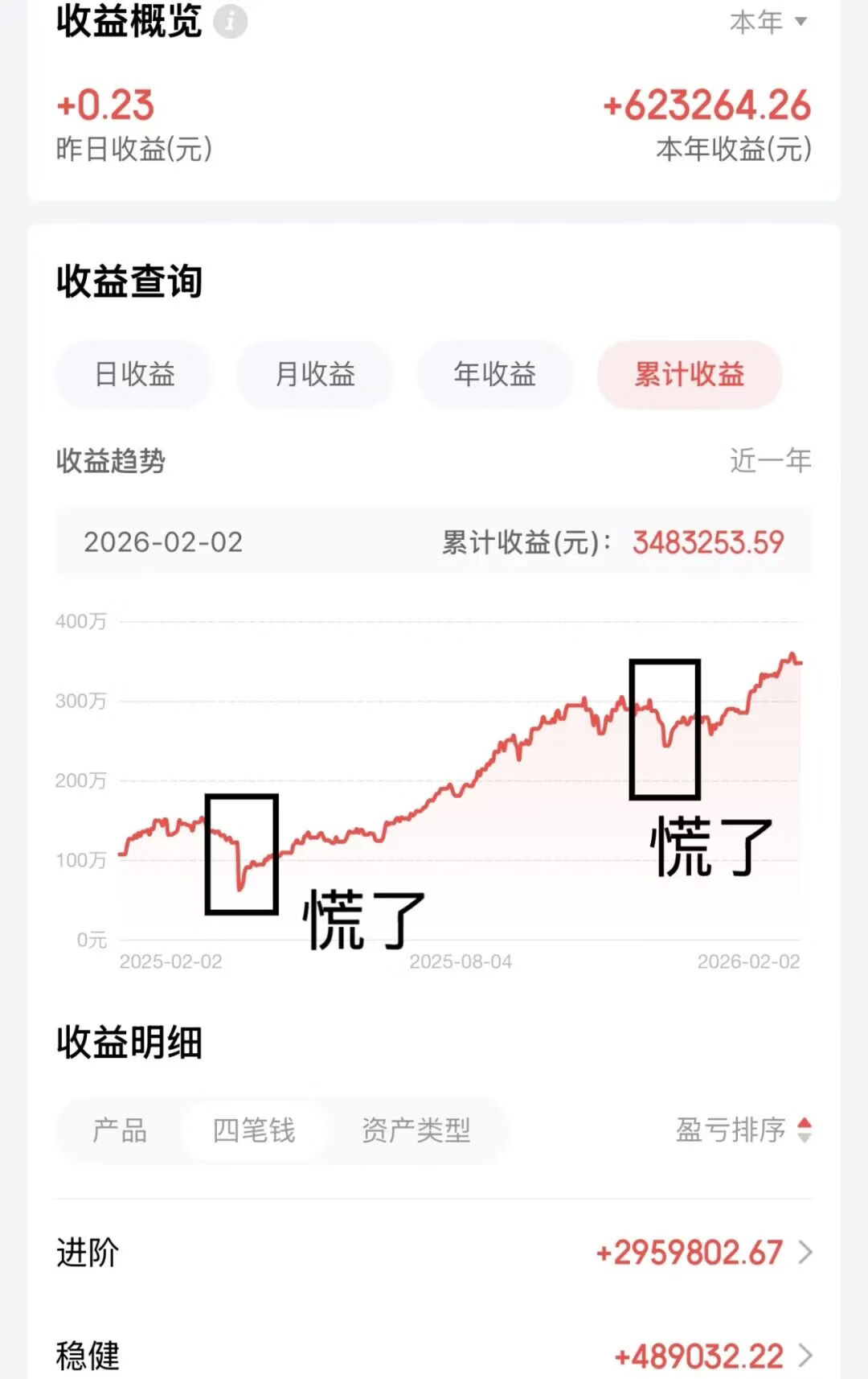 牛市里也会有多次下跌。像25年4月7日、25年11月份的6连跌,那两次我都亏了50、60十万,但都熬过来了,后来收益也继续创新高。趁着市场大跌,今天纳指期货也跳水了,我今天继续补点耐心穿越牛熊。
