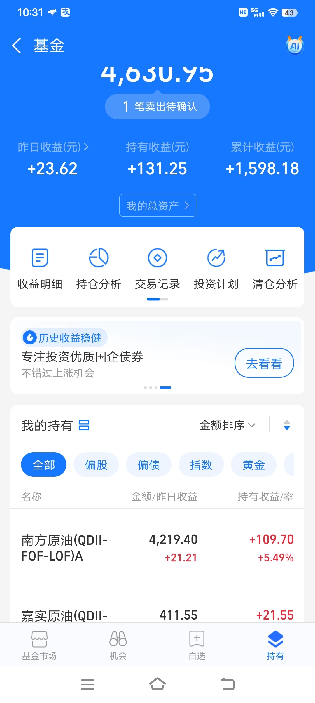 $嘉实原油LOF(SZ160723)$ 买了4天总共4400块,挣了230块。立马跑,跑不完,只跑出来一半。另外一半还没有一个星期,手续费1.5%。