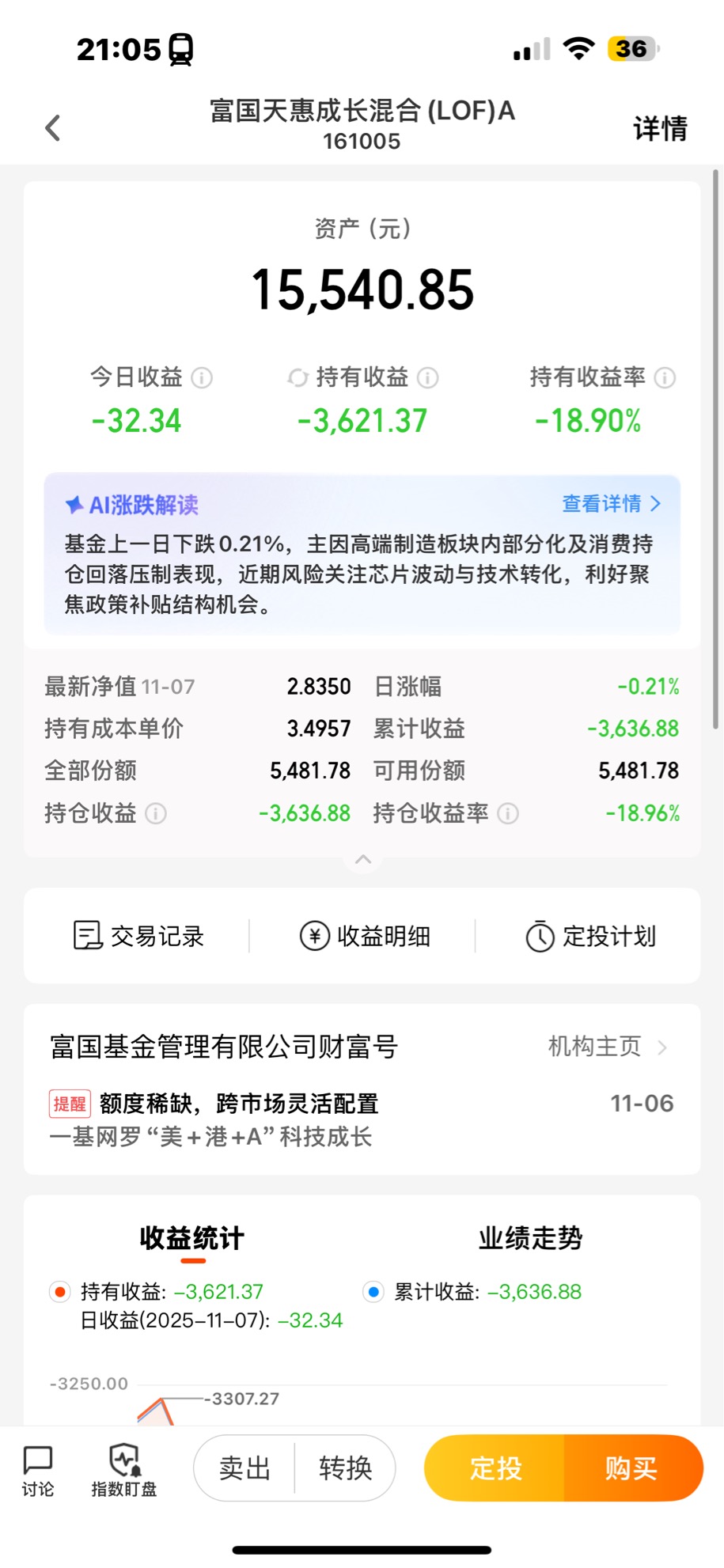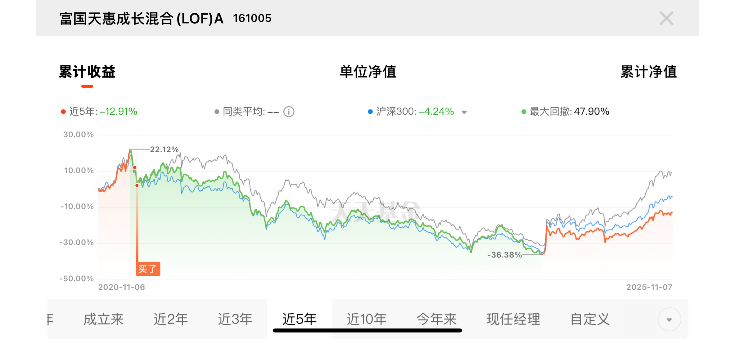 $富国天惠成长混合(LOF)A[161005]$ 本人两个号分别持有该基金a类和c类总共5万多,持有四年多,一毛钱没赚目前还亏十几个点,准备跑路了,大家可以好好看看这只基金近几年的表现,比沪深300都差了一大截,有钱花不出去的可以来玩玩