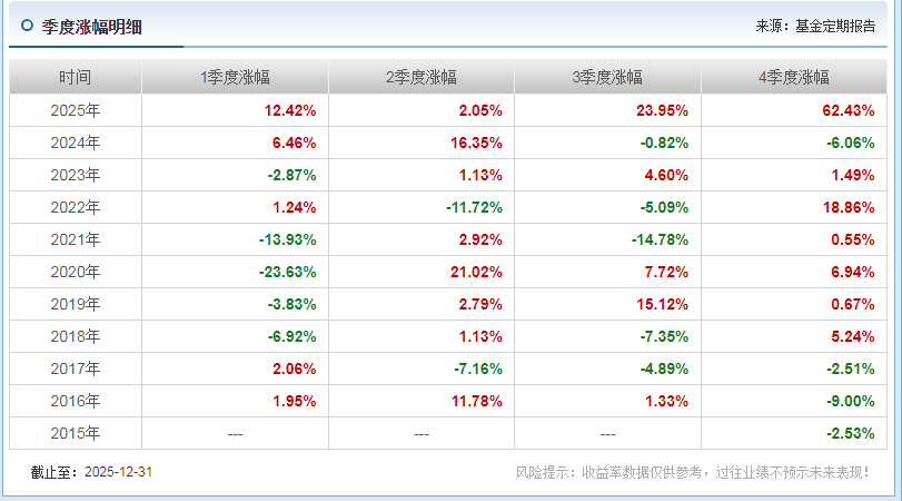 这个是成立至今的季度收益率数据,直观的感觉,波动非常之大。而且截止到2024年12月31日,这只基金是不赚钱的(微亏),近10年的时间,累计收益是负的,相信没有几个投资者能坚持住。如果你再多坚持一年,2025年收益率是:130.99%,前面近10年的等待,一年拿到回报。