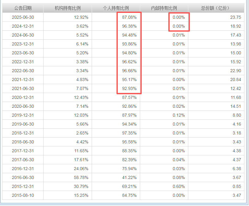 但是,从持有人的数据来分析,恰恰是个人持有者占大部分,非常有趣的是,在大涨前夕,内部持有比例是0%,在此之前,0.01%,虽不多,但内部毕竟持有。2025年开始大涨,内部在2024年全部卖光了。