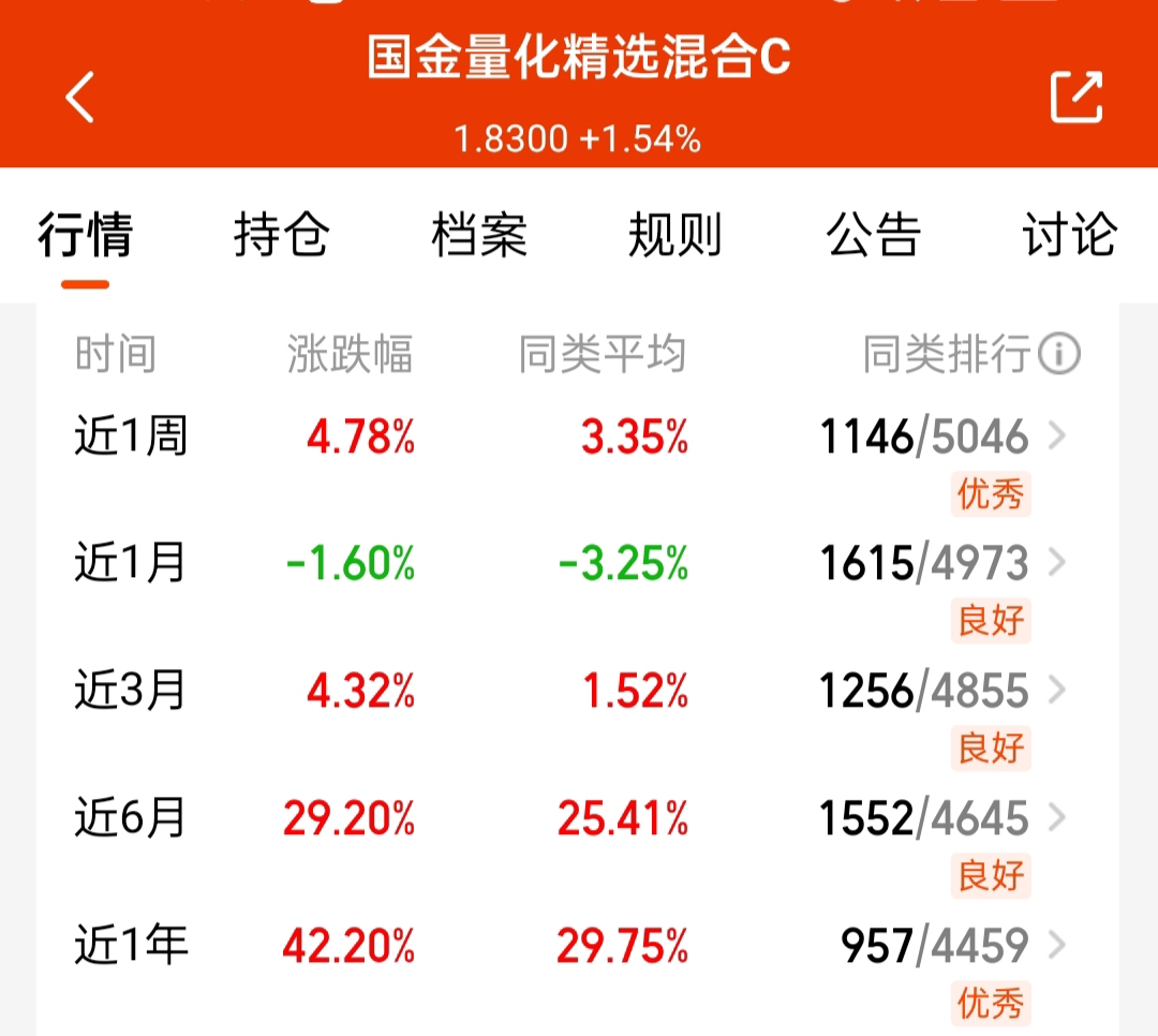今天还不错,拿的$国金量化精选混合C$ 长期短期业绩都很优秀,限额打开了,抓紧冲