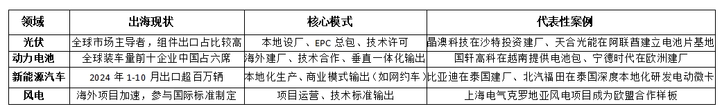这是推动全球绿色转型的重要力量。下面这个表格梳理了主要新能源领域的出海现状和核心模式,可以帮助您快速把握全局。