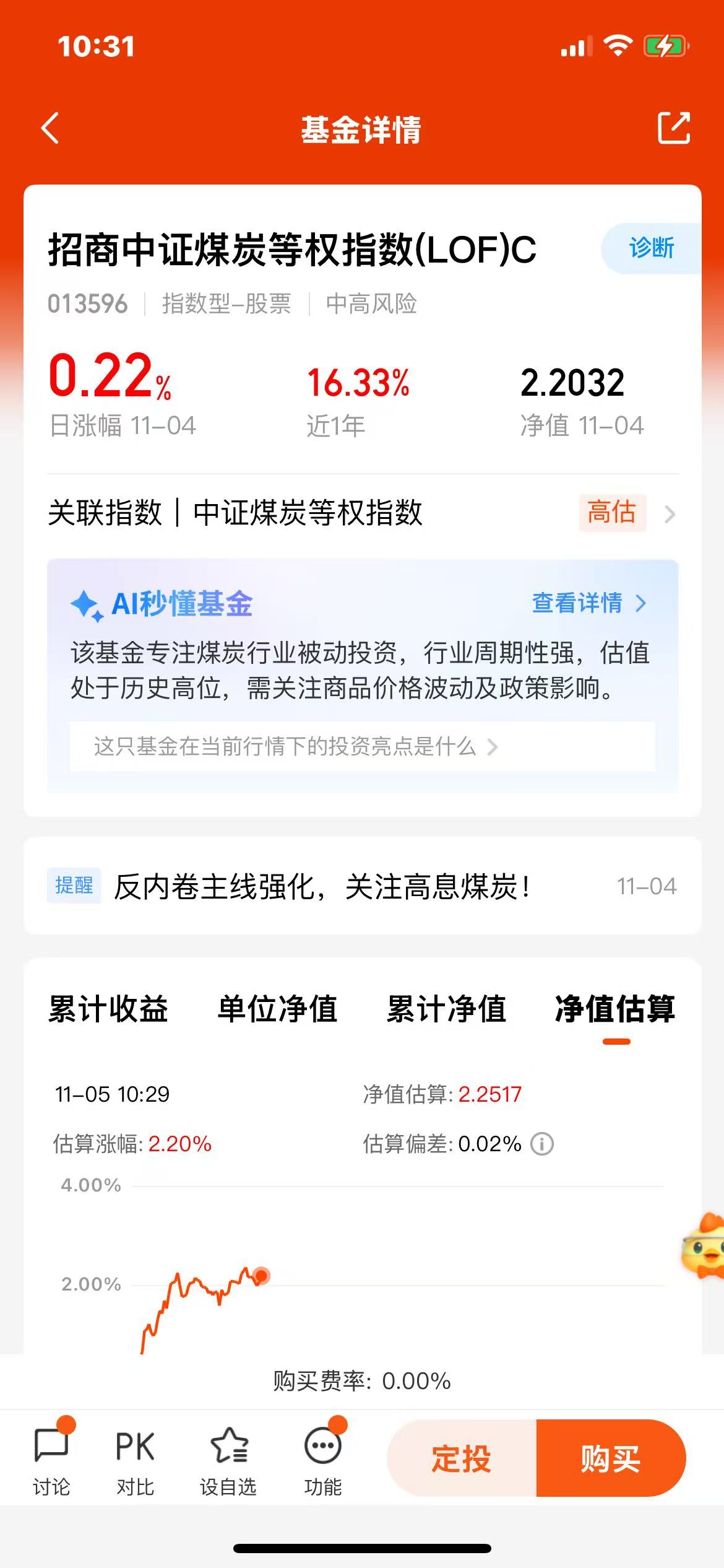 今天$招商中证煤炭等权指数(LOF)C(OTCFUND|013596)$延续上涨趋势,已经三连涨,早盘开盘就强,现在估值已涨超2%