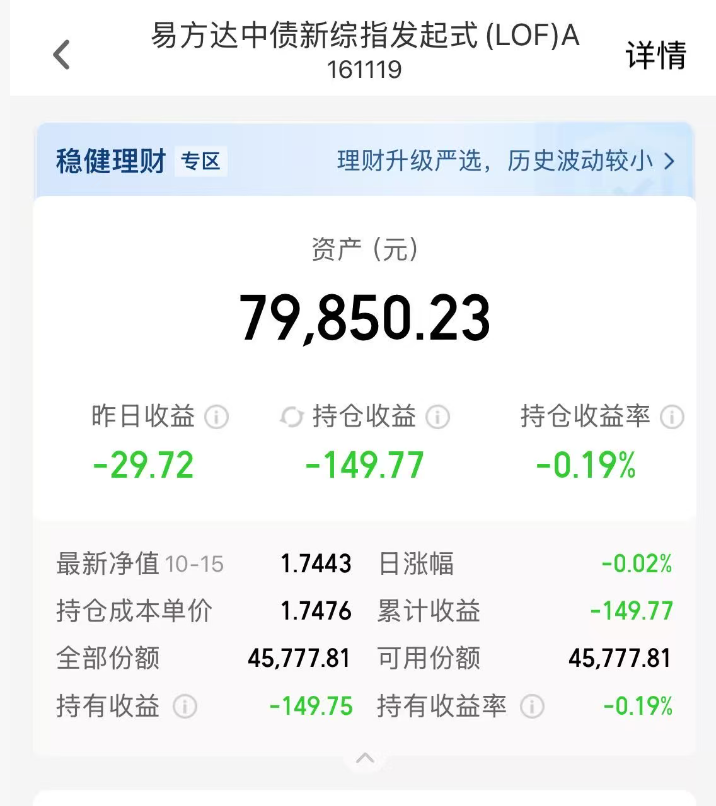 易方达这只综合债指自我持有以来,目前小幅浮亏,不过浮亏不多,估计马上就能摆正了。整体来看,易方达这只产品目前年化2.09%,高于短债基金,基本符合我对他这只混合债指的收益预期。目前债市还在低位,等一切回归基本面以后,我相信债市会有更好的答卷。我再补2w。