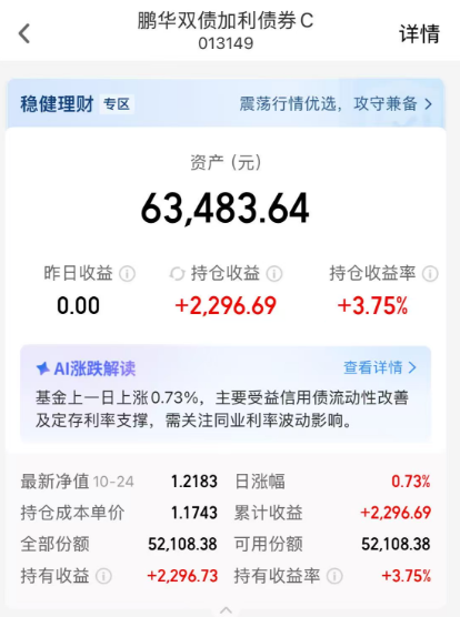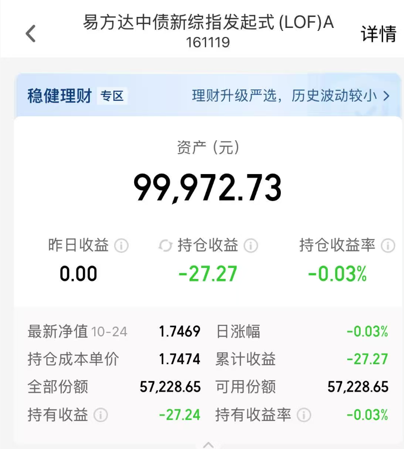 而且10月以来,债市和之前比已经出现了回暖态势,只是长期限的敏感更容易被大家注意。好比明明油车自燃率高于电车,但后者自燃的事件更容易被大家注意一样。我的持仓10万元,目前小幅浮亏20来块,扣除管理费,收益基本持平。目前A份额年化2.41%,近一个月涨幅0.3%,符合债市整体的走势和我的配置预期。