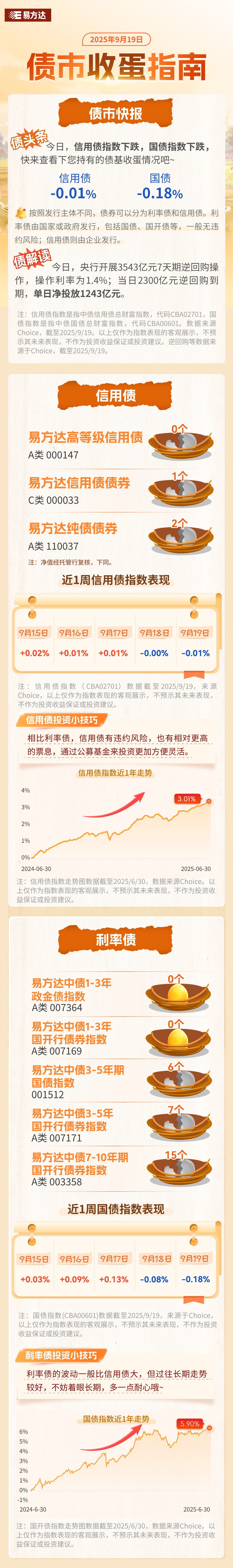 9月19日,信用债指数下跌、国债指数下跌,快来查看您持有的债基收蛋情况吧!