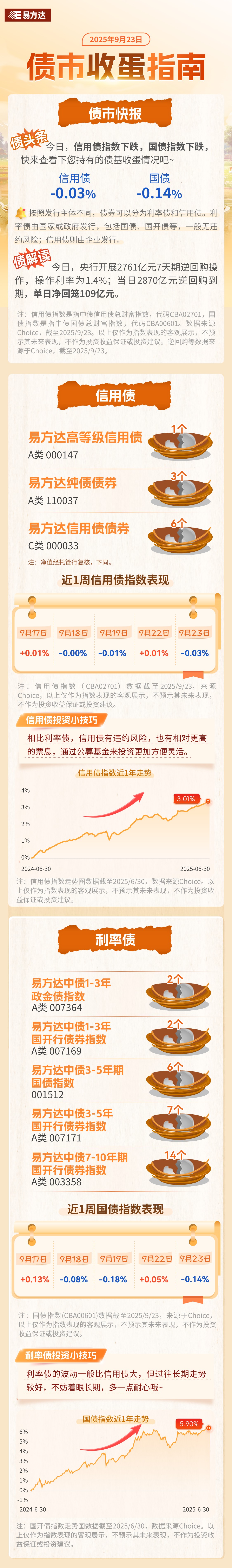 9月23日,信用债指数下跌、国债指数下跌,快来查看您持有的债基收蛋情况吧!