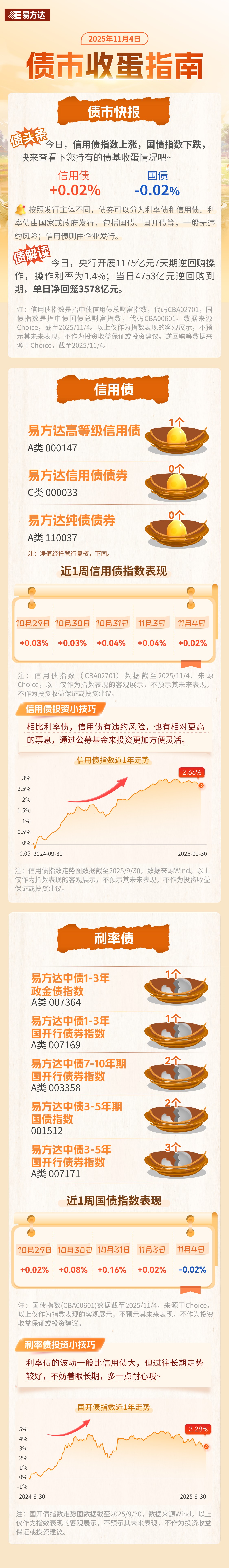 11月4日,信用债指数上涨、国债指数下跌,快来查看您持有的债基收蛋情况吧!