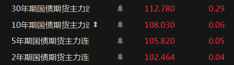 国债期货全面上涨,30年期主力合约盘0.29%,10年期0.06%,5年期0.05%,2年期0.04%。