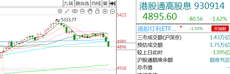 资金最近比较抱团成长方向,红利这边在半年线未有反弹,今天延续调整。三连跌,倾向看反弹,股息率还是比较有吸引力,跌多了也会轮动上涨。