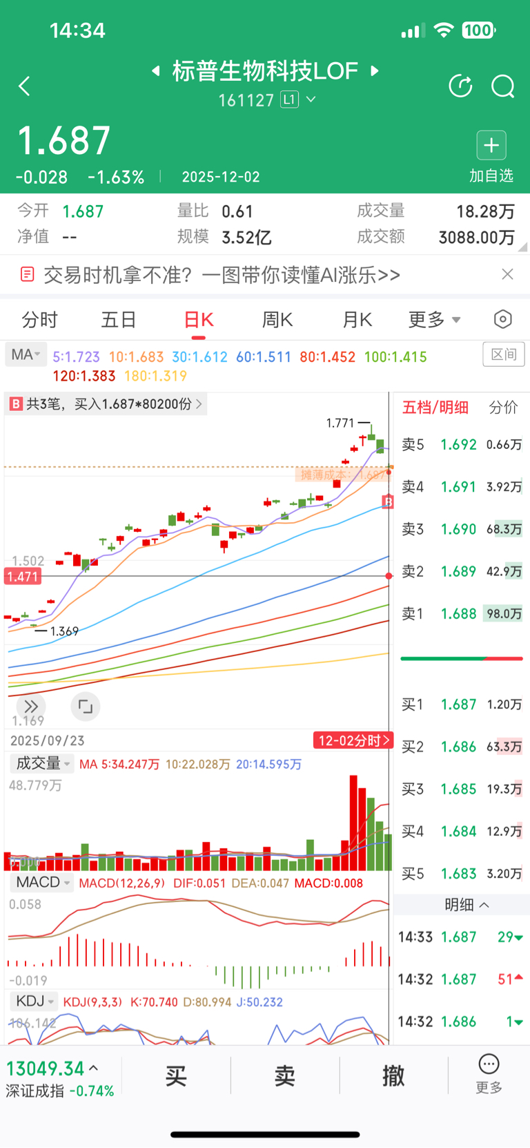 $标普生物科技LOF(SZ161127)$ 1.686根本买不到。挂了一天了。加价买进去了。但愿我没看错你。别辜负我