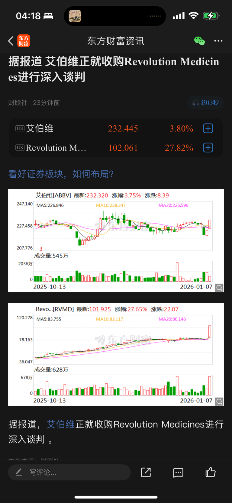 据报道艾伯维正就收购RevolutionMedicines进行深入谈判