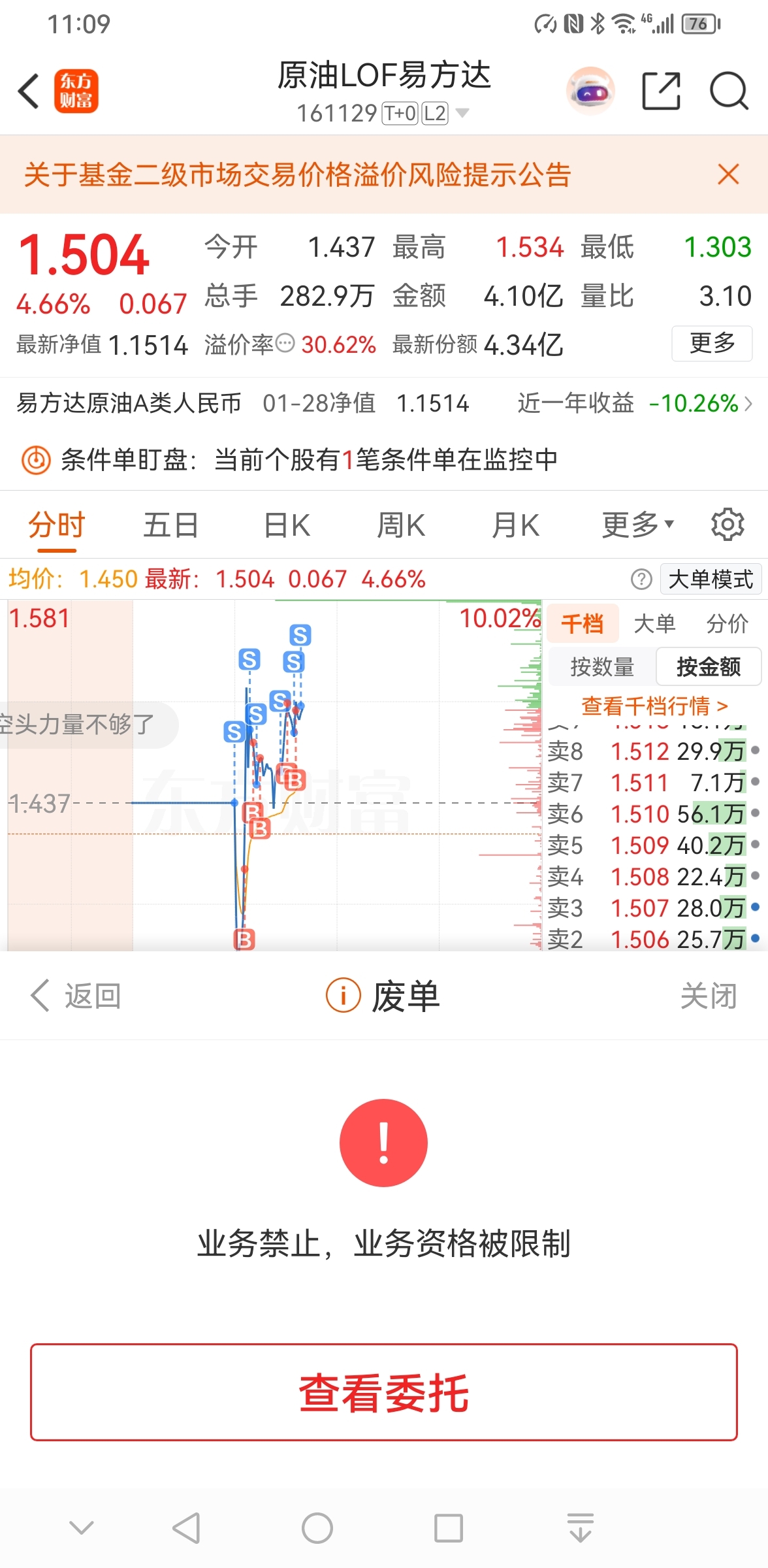 $原油LOF易方达(SZ161129)$ 大家买了的别撒。限制交易了,不让我买了