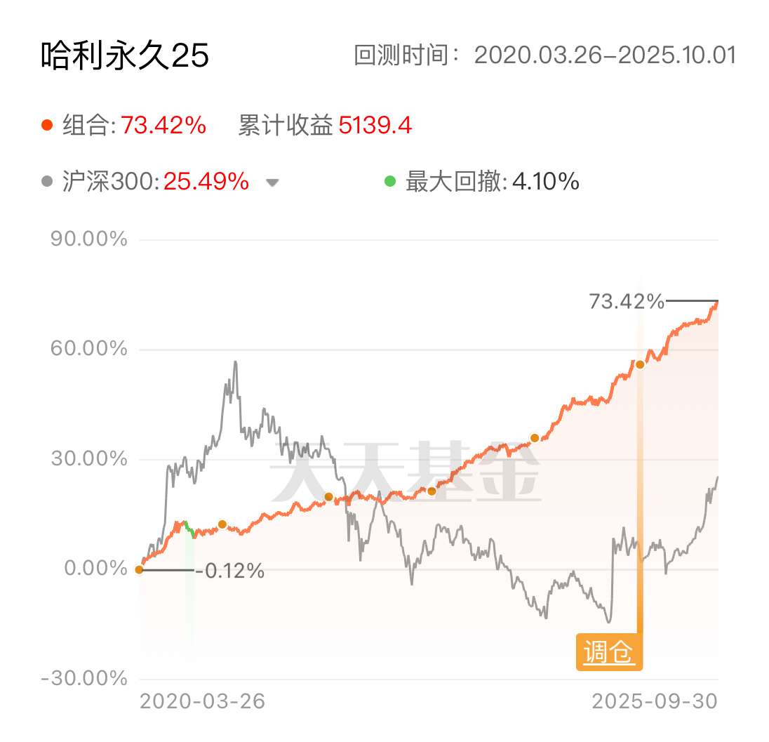 策略要求每年进行一次再平衡,将偏离25%比例的资产调整回原比例;例外就是如果单一资产超过35%或低于15%则可启动临时再平衡调仓。