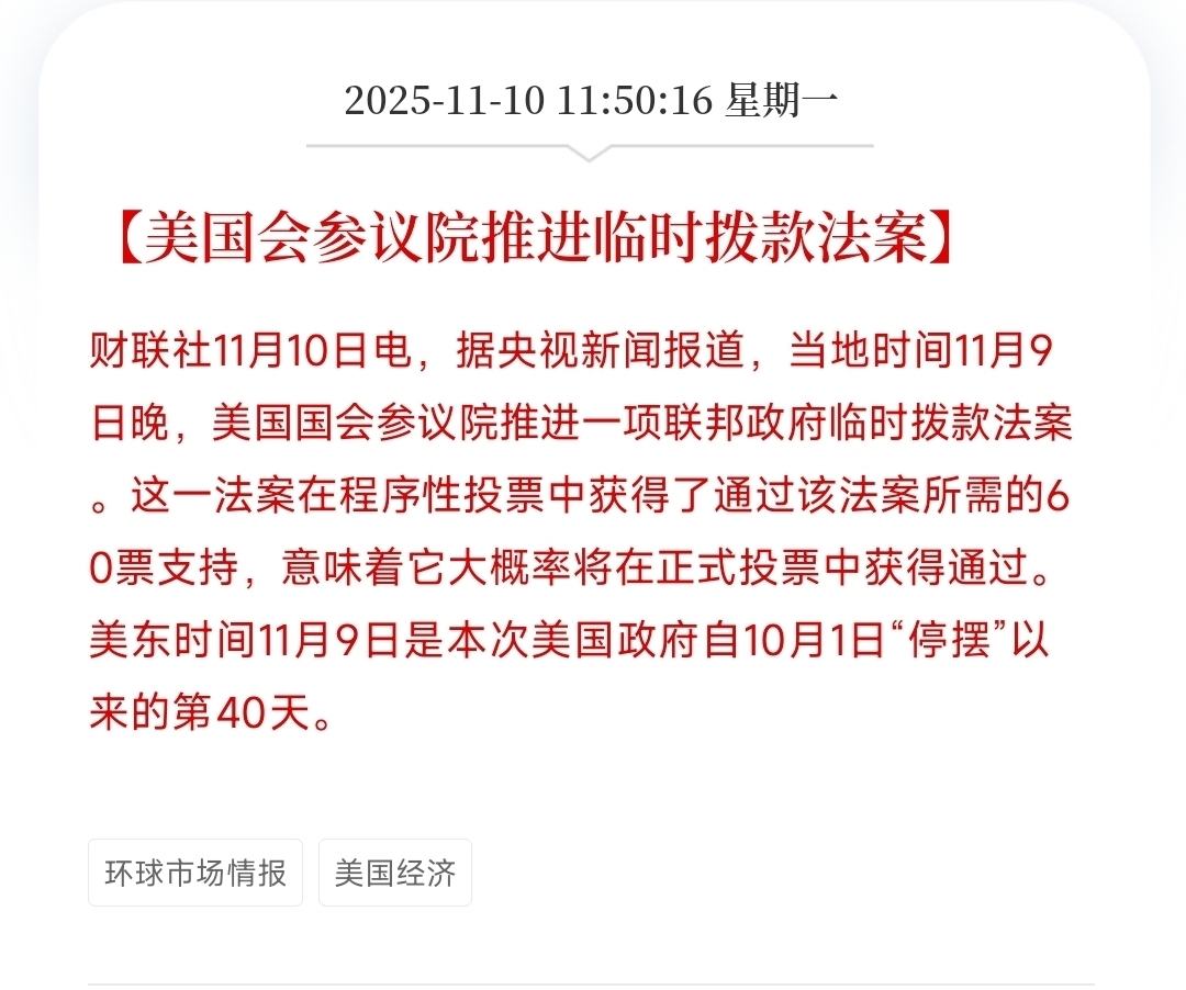 好消息,西大关门有望结束,短期关门不影响市场,之前关门首日纳指还是上涨的。