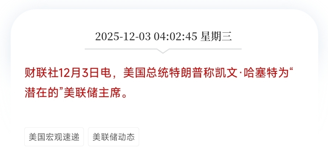 这是太太太想降息了,鲍师傅明年五月到期,明年这个放水节奏要加速,行情还是很期待的,不过后年就是降息尾声,这时候要看AI是泡沫,还是业绩能持续高歌猛进,走一步看一步吧