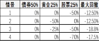 含股量25%:对于高波动的股票控制比例仅为25%,也就是部分相对激进的固收加策略的含股量的水平,这样也就压制了高波动资产的波动总量。参考多次分享的下表极限情况下最大回撤水平,也就是各种网络回测验证最大回撤-10%左右了。